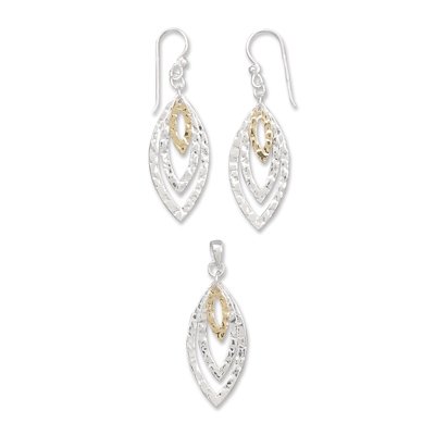 18K Gold Plate and Sterling Silver 1.625 Hammered Pendant and 1.5 in long Earrings on French Wire Set. Search phrases: necklace and earring sets, necklace & earring sets, necklace sets, vermeil