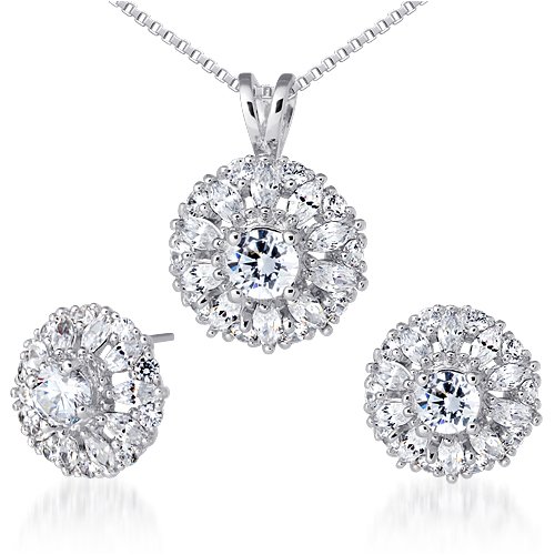 Round Shape White Cubic Zirconia Pendant Earrings Set in Sterling Silver Earrings: White Cubic Zirconia : 2 pieces, Round Shape, 5.00 mm. White Cubic Zirconia: 20 pieces, Marquise Shape 4x2 mm. White Cubic Zirconia: 20 pieces, Round Shape 2.00 mm. Dimension: 1/2 x 1/2 inch. Pendant: White Cubic Zirconia : 1 piece, Round Shape, 5.00 mm. White Cubic Zirconia: 10 pieces, Marquise Shape 4x2 mm. White Cubic Zirconia: 10 pieces, Round Shape 2.00 mm Dimension: 3/4 x 1/2 inch. Earrings & Pendant have a total weight of 6.05 grams and are set in pure .925 Sterling Silver. From our Couture Collection, Set features ""one of a kind"" design with a beautiful ""White Gold"" finish featuring Gemstones with a gorgeous deep rich color, vibrant luster and clean clarity. MSRP 4.99 Includes a 18"" Sterling Silver Box Chain, Money Back Guarantee, Signature Gift Box and FREE SHIPPING!!!!!