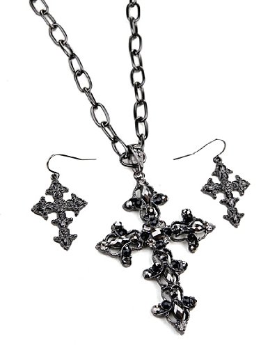 Hematite Tone Black Rhinestone Cross Pendant Necklace and Earrings Set Fashion Jewelry Review