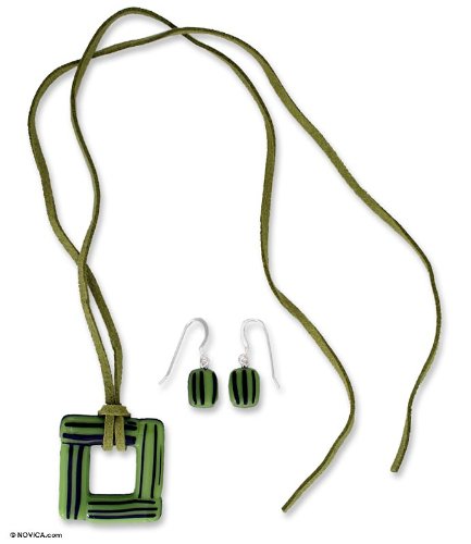 NOVICA, in association with National Geographic, offers thousands of limited edition and one-of-a-kind gifts, jewelry, and home decor treasures handmade by master artists and artisans throughout the world. Glistening squares in deep green evoke elegant chic in an exclusive design by Aline Romero. The pendant and earrings are cast of dichroic glass, their translucent allure in harmony with the green suede cord and sterling hooks. .925 rating silver Artisan Info: "Hola! I'm Aline Romero Fernandez, from Mexico City. When I finished high school I joined my father, Marco (a Novica featured artist, with Debora) in his fused glass workshop, specializing in jewelry. I became so fascinated with the whole process of fused glass, that I realized I must have inherited my father's passion. "In 2006 I got accepted at the National School of Fine Arts, where I have been acquiring a deeper knowledge and understanding contemporary art. It has inspired in me the desire to contribute with my own art, my way of perceiving reality, and I have realized that the best medium to convey it is through glass. It has been present in human history for centuries and that even today remains innovative. "Glass offers as many possibilities as it does challenges, which inspires me to create and share my designs with society."