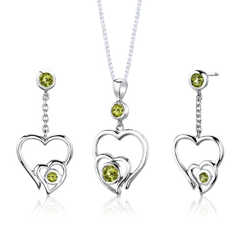 Earrings = Genuine Peridot, 2 pieces, Round Shape, 4.00mm, Genuine Peridot, 2 pieces, Round Shape, 3.00mm. Earring Dimension: 1 3/8 x 5/8 inches. Pendant = Genuine Peridot, 1 piece, Round Shape, 5.00mm. Genuine Peridot, 1 piece, Round Shape, 4.00mm. Pendant Dimensions: 5/8 x 11/4 inches. Earrings and Pendant have a total weight of 6.60 grams and are set in pure Sterling Silver with .925 stamp. Gemstones have a vibrant rich color and eye clean clarity. The Pendant and Earrings feature top quality workmanship and a beautiful finish. Includes Free 18 inch Sterling Silver Box Style Chain, Free Ribbon Gift Box and Free Shipping.