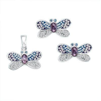 Sterling Silver Multi Colored CZ Ferido Style Butter Fly Pendant Earring Set Overview